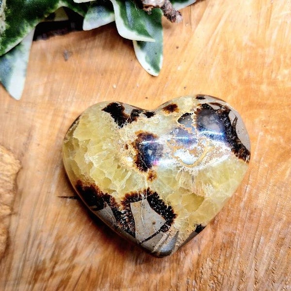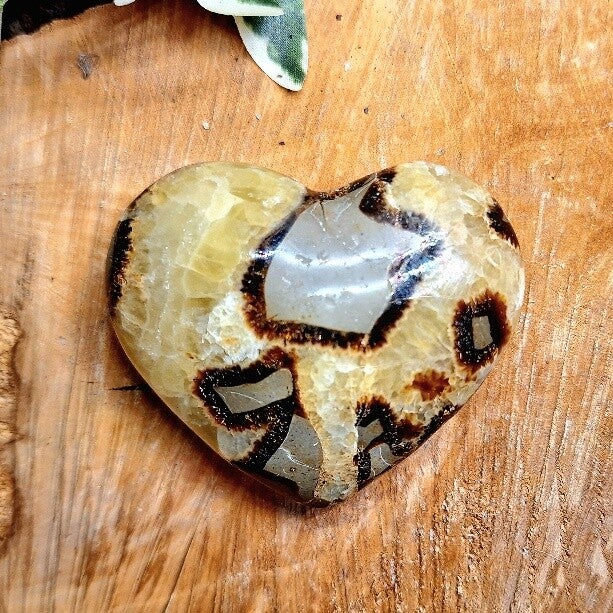 Septarie bestaat uit uitgeharde klei die beginnen barsten is en waar in de holtes gele calciet is gekomen. Dat maakt zeer herkenbare patronen in deze steen.Afmetingen ong 6 cm breed x 5,5 hoog x 2,2 dikte