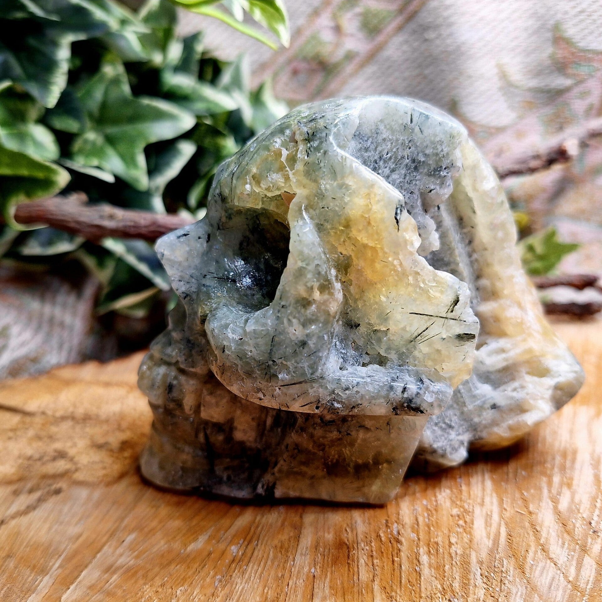 Prachtige prehniet skull met mooie groene en gelige tinten.
